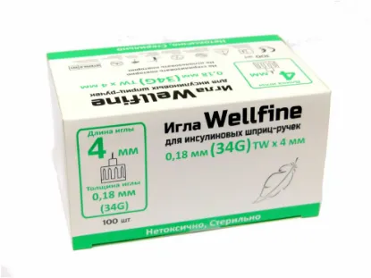 Иглы Веллфайн / Wellfine 34G для шприц-ручек, ультра-тонкие, длина 4 мм, 100 шт.